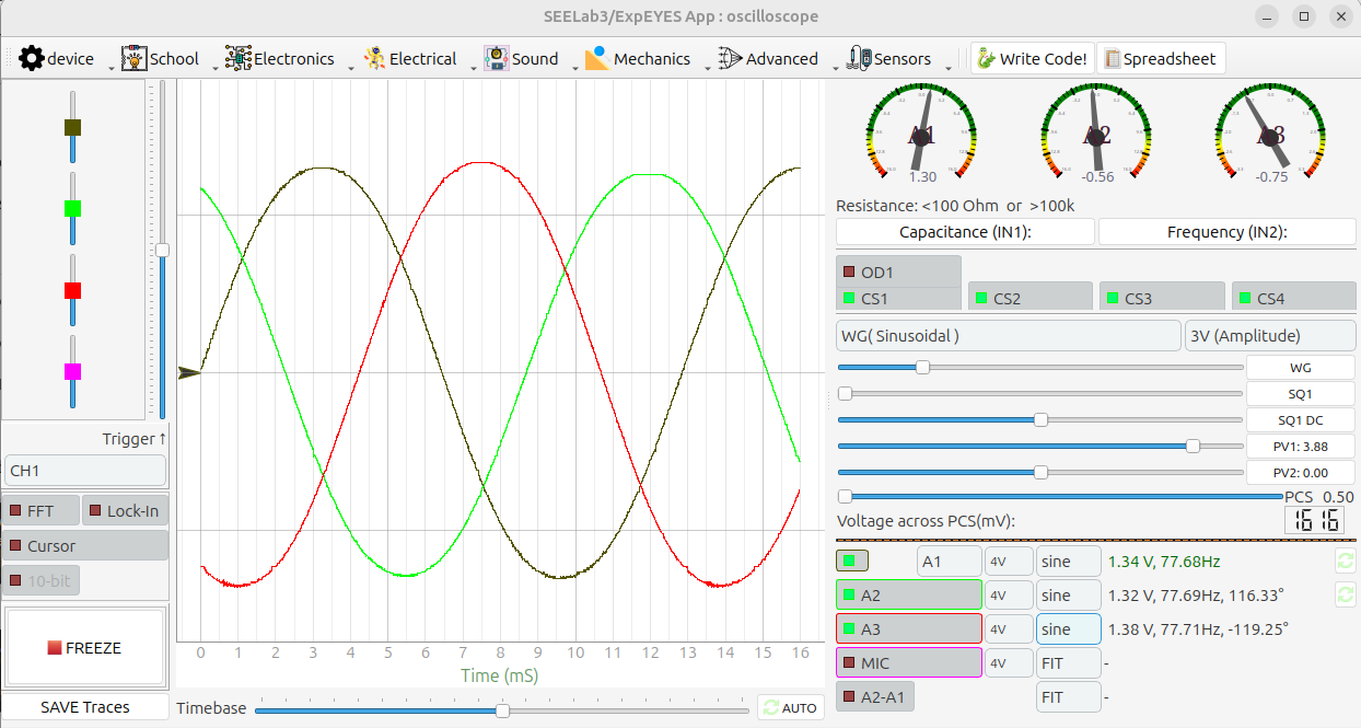The setup gave 3 clean sine waves with almost 120 degree phase difference between each. The small error can be attributed to mounting the coils in their sockets which have some tolerance.