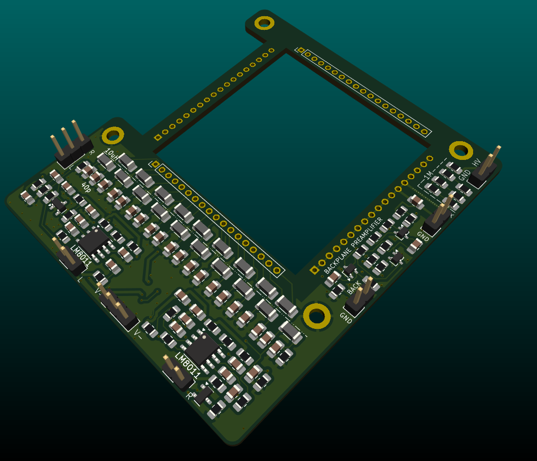 Designed in KiCAD, this is an MWPC I made for charged particle detection. The top side has equally spaced wires of 20 micro thickness, with L-C chain connecting them. On either ends I have placed preamplifier circuits as well as high speed trigger signal generators. The backplane also consists of wires maintained at a high voltage.
